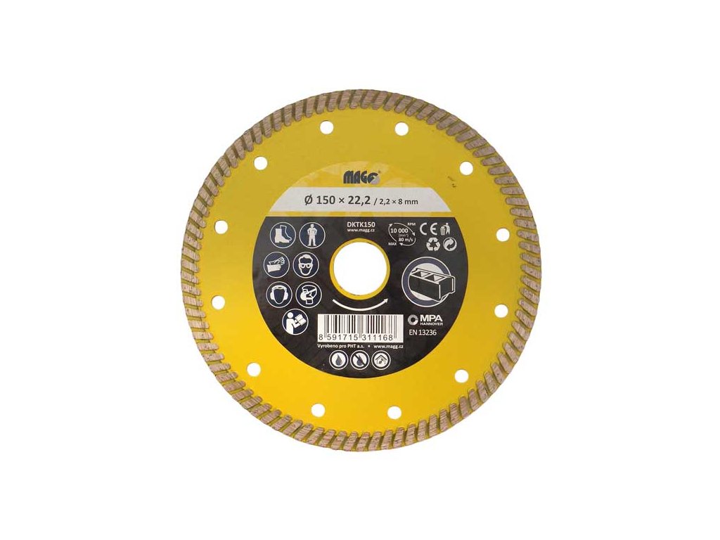 - Diamantový kotouč TURBO SPEED 150 x 22,2 / 2,2 x 8 mm - Do úhlových brusek - Průměr otvoru: 22,2 mm - Tloušťka segmentu: 2,2 mm - Výška segmentu: 8 mm - Tloušťka kotouče: 1,4 mm - Max. rychlost: 80 m/s - Max. otáčky: 10000 RPM Použití: pískovec, porobeton, cihly, zámková dlažba,vnitřní obklady a dlažby, střešní tašky, střešní tašky pálené, vnější obklady, plavená dlažba, žula-granit, mramor. Vhodné pro suchý i mokrý řez. Vyroben podle EN 13236, certifikace MPA HANNOVER, NěmeckoDoplňkové parametry
