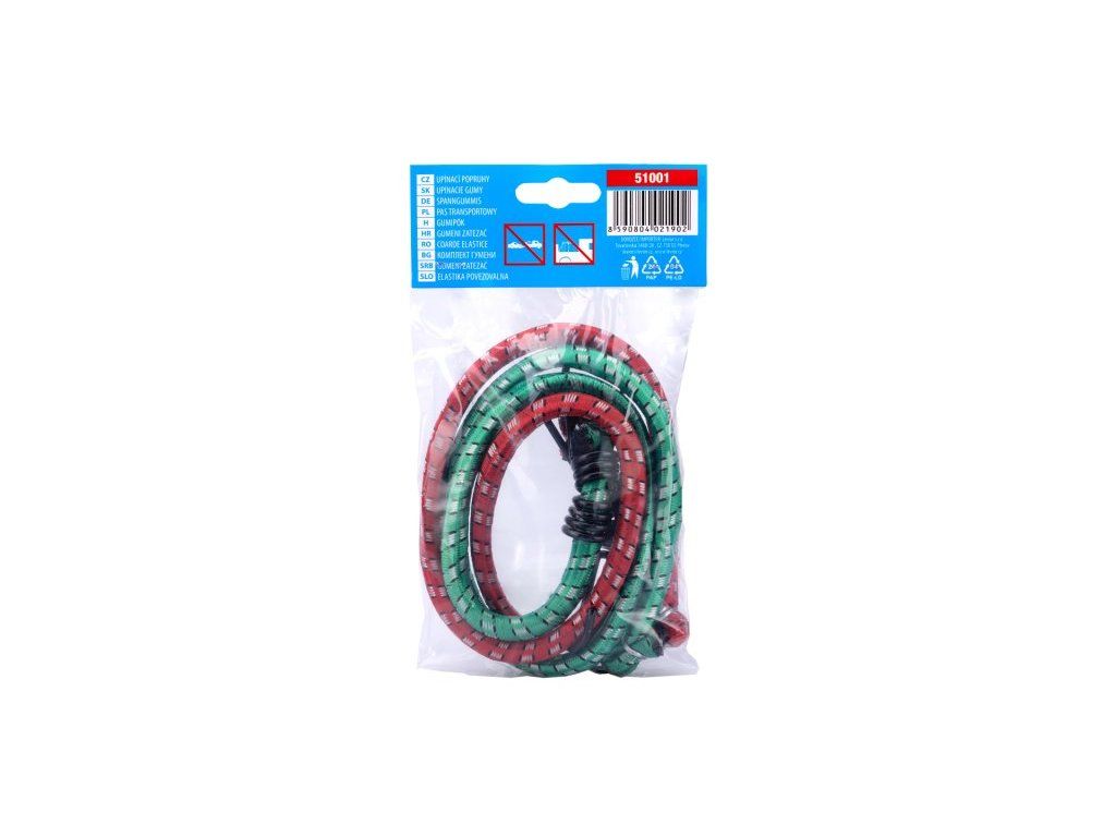 Elastické gumové popruhy, opletené polyesterem a zakončené oboustranně háky z ocelových poplastovaných drátů k uchycování zavazadel.Doplňkové parametry