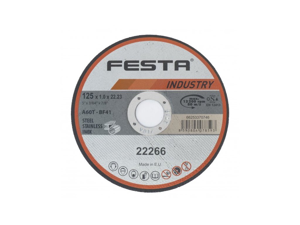 - Profesionální řezný kotouč na kov, litinu, NEREZ, vyrobeno v EVROPĚ! - Řada kotoučů FESTA INDUSTRY je, jak již z názvu vyplývá určena zejména pro profesionální použití, kvalita ověřená reálnými zkouškami zaměřenými na počet a rychlost řezů - Druh zrna - KORUND - Pojivo - syntetické pryskyřice na bázi aldehydu - Provedení – ROVNÝ - Max. pracovní rychlost - 80 m/s - Max. přípustné otáčky - 12200 ot/min - PRO ZVÝŠENÍ PEVNOSTI ARMOVÁNO DVOUVRSTVOU SKLOTEXTILNÍ VLOŽKOU! KOTOUČE FESTA INDUSTRY SPLNUJÍ EN 12413 a homologaci OSA!Doplňkové parametry