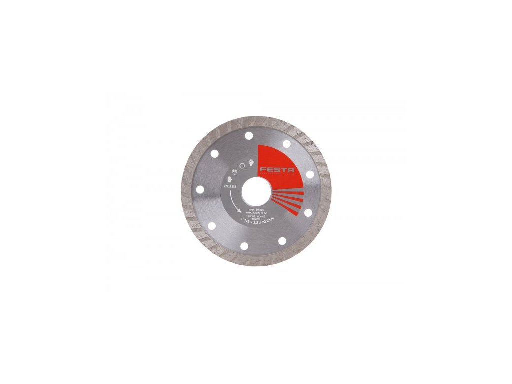 Diamantový kotouč FESTAProvedení : TURBO, kvalitní materiály i zpracování, speciální tvar diamantových segmentů i konstrukce a pevné uchycení k nosnému disku kotouče, vysoký obsah diamantového prachu
