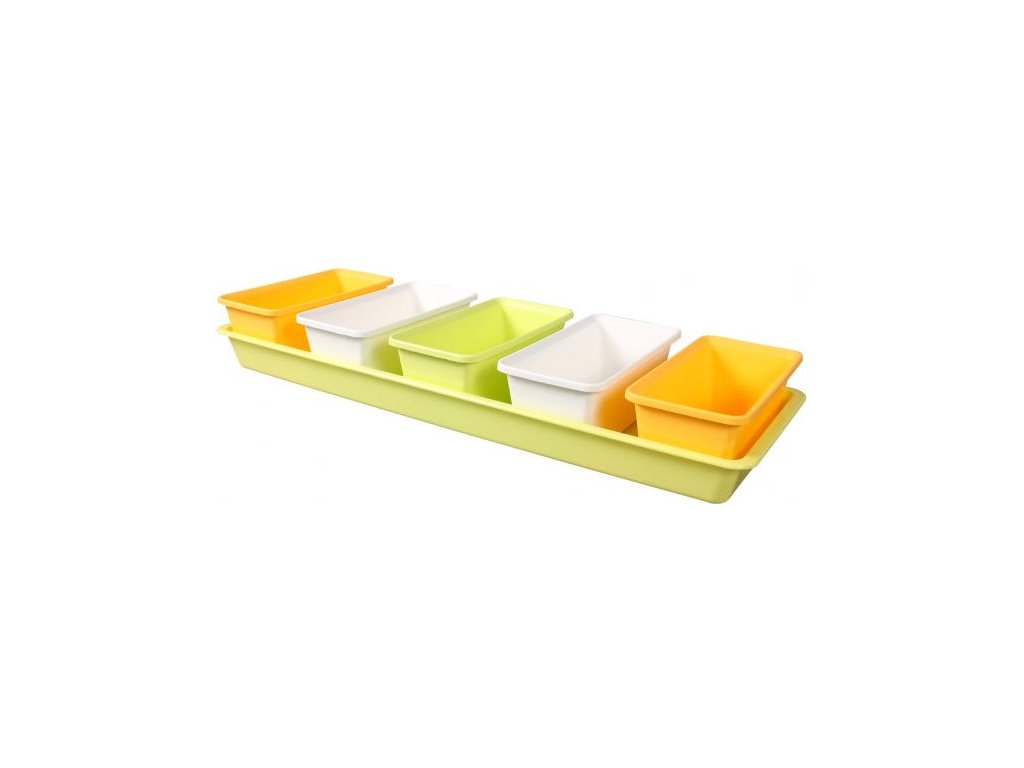 V kompletu je 5 malých truhlíků a společná miska v jarních barvách.