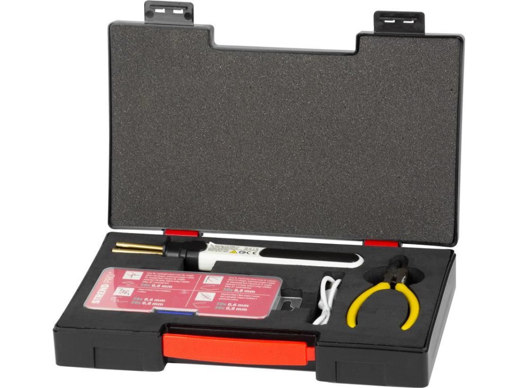 Akumulátorové pero Strend Pro pro svařování plastů je určeno pro opravy prasklin v plastových materiálech. Je ideální pro vyztužení: nárazníků, držáků žárovek, kapotáže a různých plastových dílů.Díky použití sponek je bod spojení velmi odolný a pevný. S použitím speciálního hrotu pro pájení je akumulátorové pero pro svařování plastů určeno i pro vytváření spojovaných spojů pomocí cínové pájky.