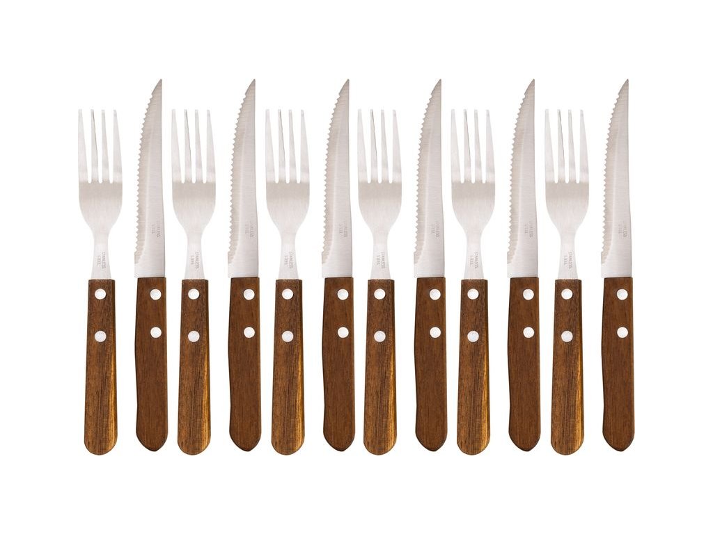 Servírovací set steakových příborů pro 6 osob je speciálně navržen pro pohodlné řezání steaků a jiných druhů masa, takže jej jistě oceníte Vy i Vaši hosté na zahradních grilovačkách.Exkluzivní sada příborů obsahuje vidličky a nože nejvyšší kvality, jsou vyrobeny z nerezavějící oceli v kombinaci s dřevěnou rukojetí. Kvalitní zpracování příborů zajišťuje dlouhou životnost. Design příboru dodá Vašemu stolování rustikální vzhled.