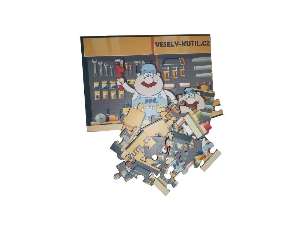 Dětské deskové puzzle s motivem Veselýho Kutila, které je možné skládat přímo na přiloženou pevnou podložku s předlohou pro skládání.