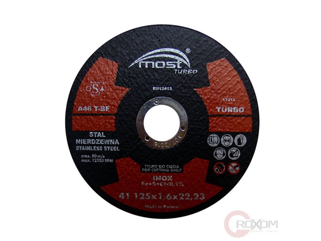 Řezný kotouč MOST 125x1,0 mm A60T-BF INOX - popis produktu - rozměr kotouče 125 x 1,0 x 22,23 mm, specifikace T41 A46T-BF INOX - plochý kotouč na řezání nerezové oceli - tvrdý kotouč pro univerzální použití - použití na tenkostěnné profily, plechy, ocelové pruty apod. - max. otáčky 13300 RPM, max. obvodová rychlost 80m/s - vyroben dle normy EN12413Doplňkové parametry