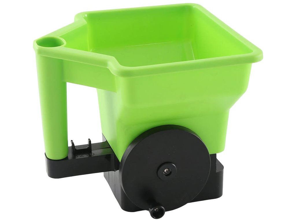 Stačí naplnit plastovou nádobu požadovaným materiálem, nastavit velikost otvoru podle typu směsi (úroveň 1 – 3) a během chůze rovnoměrným tempem otáčet rukojetí. Pro rovnoměrné pokrytí plochy se doporučuje mírné překrývání jednotlivých pásů.