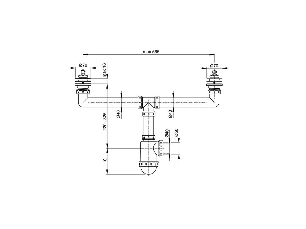Sifon pro dvoudřez průměr 50/40, s nerezovými mřížkami průměr 70 mm