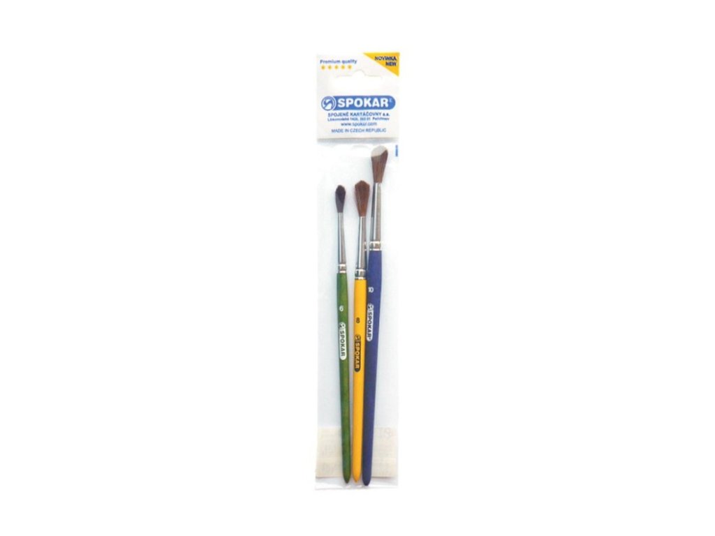 Kvalitní školní štětec SPOKAR, kulatý, má dřevěné lakované držadlo, jemná živočišná vlákna, viditelná délka vláken 14 až 20 mm, sada obsahuje velikost číslo 6, 8, 10.