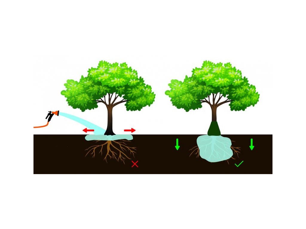 - Zavlažování ve stylu kapání zabezpečuje pronikání vody hluboko ke kořenům stromu.